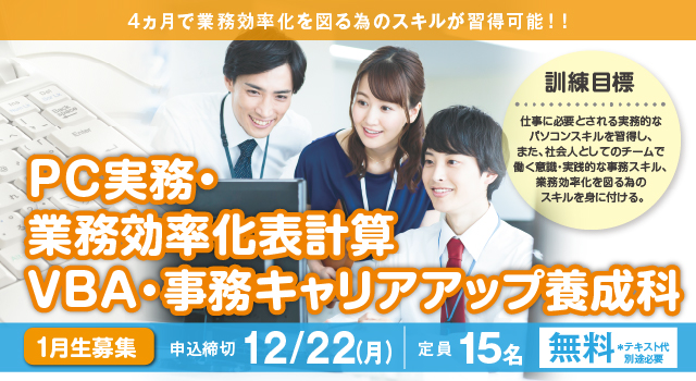 [2022年1月 開講](大阪 梅田・実践)PC実務・業務効率化表計算 VBA・経理キャリアアップ科 追加募集![受付終了]