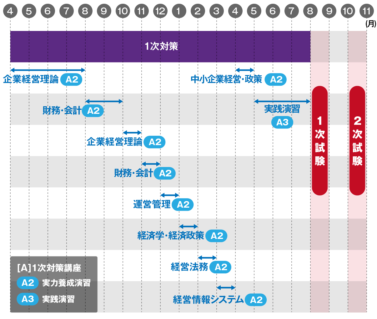 [A1:基本講義① 月曜日]→[A1:基本講義② 水曜日]→[A2:実力養成演習① 木曜日]