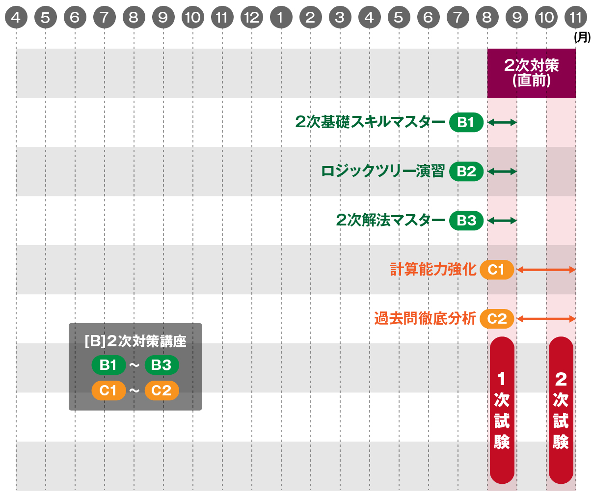 2次試験対策のフェーズのうち、直前対策(B・Cの8, 9月クラス)に特化した短期集中コース。