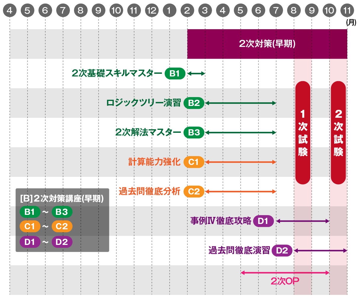 B2 ロジックツリー演習 | B3 2次解法マスター | B4 2次基礎能力実践 | C1 計算能力強化 | C2 過去問徹底分析 | D1 事例Ⅳ徹底攻略 | D2 過去問徹底演習 |